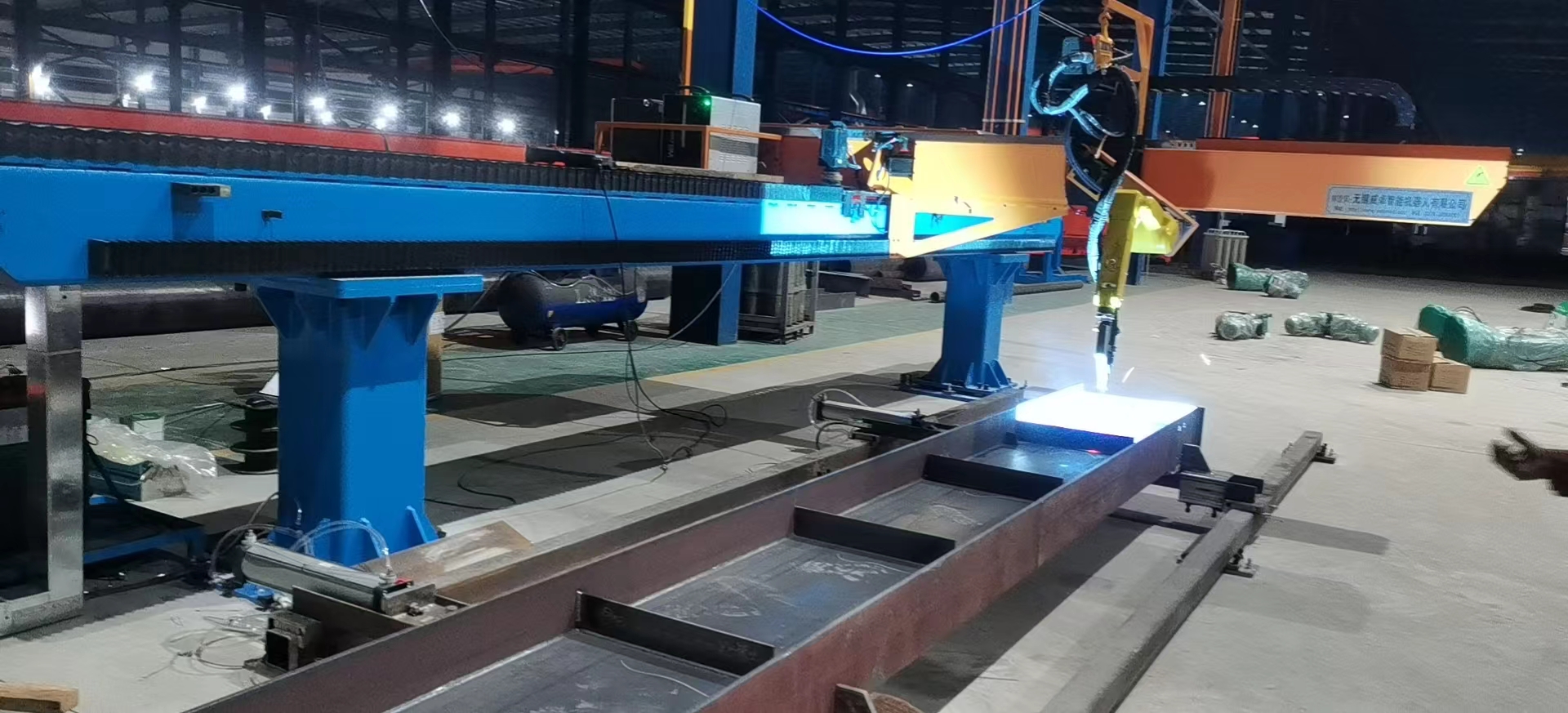 智能焊接在鋼構(gòu)行業(yè)的成功應(yīng)用針對(duì)鋼結(jié)構(gòu)中常見(jiàn)的H型鋼等鋼梁工件,威卓設(shè)計(jì)研發(fā)了小龍門(mén)智能焊接工作站,焊槍部分使用鋼梁專(zhuān)用焊槍?zhuān)m用于鋼梁焊接;搭配傳感器使用,自動(dòng)尋位識(shí)別焊縫,無(wú)